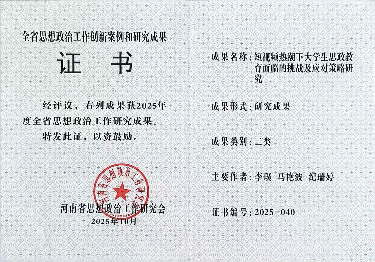 近日,2025年度河南省思想政治工作研究成果评选结果公布。我校服装设计学院李璞、马艳波、纪瑞婷三位教师…